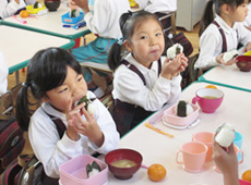 お昼ご飯の時間です。 各クラス揃って「いただきます!」。 食べ終わったら口をゆすぎ、年長組になると歯磨きをします。 みんなが食べ終わるまでゆっくり過ごします。